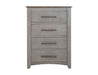 4 Drawer, Chest. The Ridge Chest features four spacious drawers, offering plenty of storage for all your bedroom essentials. It features sleek metal handles that enhance its modern aesthetic. Made from Melina and poplar wood, this collection guarantees durability and timeless appeal. The elegant light gray finish and brown tops blend seamlessly with any décor style. Additionally, the channeled design adds a touch of sophistication and texture to the furniture.
