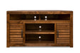 The Sausalito 52" Corner TV Stand from Bridgevine home delivers a modern robust silhouette with a slightly rustic and urban feel. Skillfully crafted from Knotty Alder Solids and Veneers, this corner entertainment center boasts intentional distressing and a rich Whiskey finish that enhances the natural wood grain. Featuring a space-saving design, three shelves and two doors with horizontal slat detailing and Flat Black hardware, this Corner TV Console will accommodate TVs up to 55 inches and provide ample storage for media and gaming consoles and home décor favorites. Cable management openings on the back panel will keep your cords and wires concealed. Fully assembled upon arrival, all furniture from Bridgevine Home is ready to unbox and enjoy.