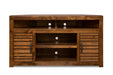 - Dimensions: 52 in. wide x 29 in. tall x 16 in. deep|Middle Shelf Dimensions: 23 1/4 in. wide x 15 in. deep. The Height between the shelves is 7 in. |Two door dimensions: 11 in. wide x 16 in. high |Fixed shelves dimensions: 10 in. wide |Soundbar shelf dimensions: 46 in. wide x 5 in. tall |Made of Knotty Alder Wood and Veneers|Made of Knotty Alder Wood and Veneers|Holds up to a 65 in. Television |||