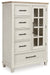 This door chest elevates the art of modern farmhouse design. Its two-tone aesthetic blends antiqued white and light grayish brown for a charming finish. Framed drawer fronts and a windowpane door lend a country feel. Conveying a feeling of relaxed comfort, the chest is sure to carry you away to a dreamy time and place.