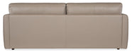 In a light and airy modern style, the Meridian Sofa has exposed wood trim on the arm fronts and is covered in the soft-colored Miami Truffle semi-aniline top grain leather, accented by designer topstitch trim and two kidney pillows.