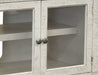 4 Door TV Stand for Wall Unit. Exuding farmhouse chic with just the right touch of old-world charm, the Stone Collection is meticulously crafted from solid pine wood. The wood is lightly distressed, showcasing a white finish and complemented by weathered gray tops.