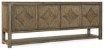 Inspired by the iconic Pacific Coast Highway, the Sundance Entertainment Console exudes character with four diamond-motif reeded front doors with soft-close hinges and touch latches. Crafted of Pecan Veneers with a Solid Wood edge top, the console has one adjustable vented wood shelf behind each pair of doors, a ventilated back panel and one 3-plug electrical outlet. The rich brown finish is Cliffside, featuring burnishing on the edges.