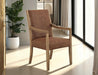Upholstered Dining Armchair. The Verona armchair is expertly crafted from pine wood, offering a beautiful blend of style, durability, and natural elegance. It features a light brown-stained frame, gently curved armrests, and gracefully tapered legs. The seat and backrest are upholstered in a faux leather, adding warmth and comfort to its refined design. With its timeless aesthetic and inviting texture, this chair perfectly balances classic craftsmanship with everyday functionality, making it ideal for cozy reading corners, stylish office settings, or as an accent piece in any modern living space.