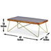 Solid mango wood in a warm pine finish is inlaid with a brass X pattern atop a modern brass finished iron base. Simple yet so stylish. Co-ordinating end table and sofa table are available for purchase separately.