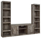 This entertainment center is sure to win your heart with its fresh take on country living. Its crisp, clean and minimalist-chic profile is enriched with a gray finish, striking replicated oak grain and thick plank styling for that much more authentic character. Crossbuck detailing adds a brilliant barn door-inspired touch. There's ample storage room, as well as plenty of open shelf space to showcase home accents, safely out of the way. Enjoy the cozy feel of a cracklin’ fireplace without the hassle of maintenance and cleanup by adding the optional fireplace insert (sold separately).
